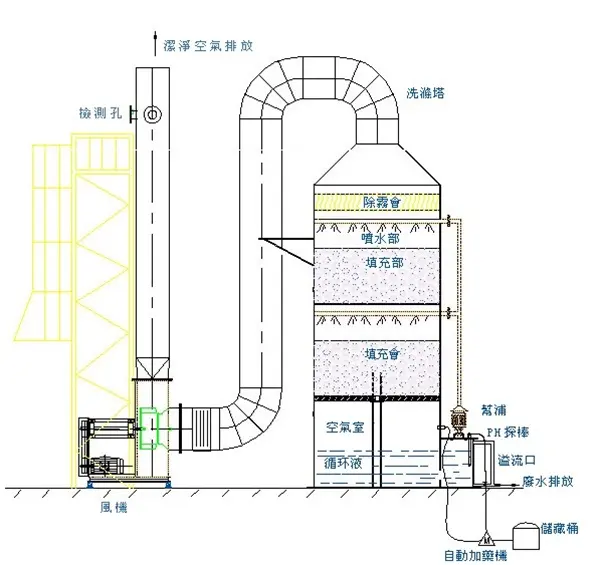 濕式除塵塔是一種濕式除塵裝置,是廢氣處理工程中常用的凈化設(shè)備。濕式除塵塔由塔體,填料層,除霧層,循環(huán)水泵及循環(huán)管路等組成。本項(xiàng)目使用濕式除塵塔,其具有占地面積小,壓降小,處理效率高的特點(diǎn)。