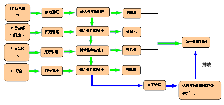 目前該公司在各車間根據(jù)不同的生產(chǎn)工藝分類收集廢氣匯入主風管,主風管接入指定廠房排風井,經(jīng)風井在離心風機的牽引作用下引入屋面廢氣治理設施,對于低濃度廢氣采用的是水噴淋吸收法,對于高濃度廢氣采用的是水噴淋吸收+活性炭吸附法,該公司為響應環(huán)保要求,擬對廢氣處理設施提標改造。