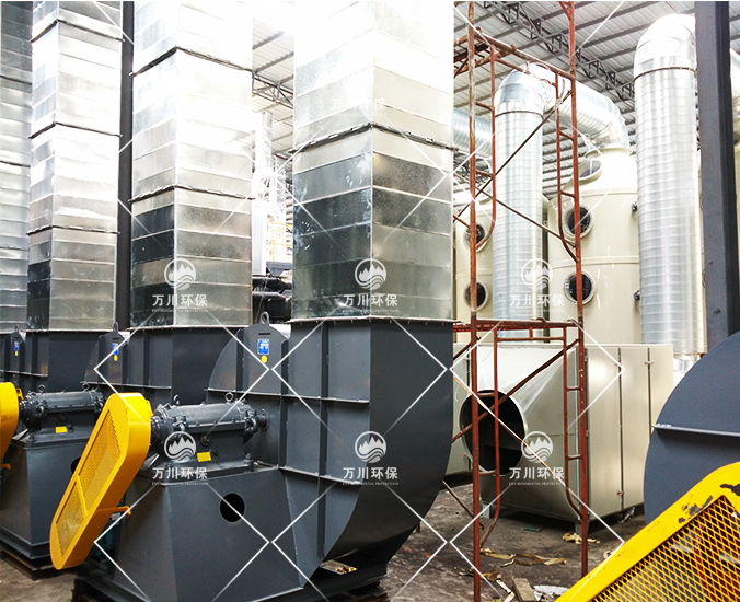 根據廠方提供的資料及現場勘察的情況。其噴漆廢氣的來源主要為無塵噴漆車間內的5條自動噴涂線。在生產過程中有噴漆,該工序產生了一定量含三苯有機廢氣和噴漆粉塵,該廢氣不僅對環(huán)境造成污染,而且對人體有較大的危害作用,同時也破壞了周邊的環(huán)境,造成了不良的影響,需進行處理后排放。我們工程師分析了該廢氣的特點和以往的案例經驗,采用了“水簾柜+噴淋塔+活性炭吸附塔”這套解決方案。