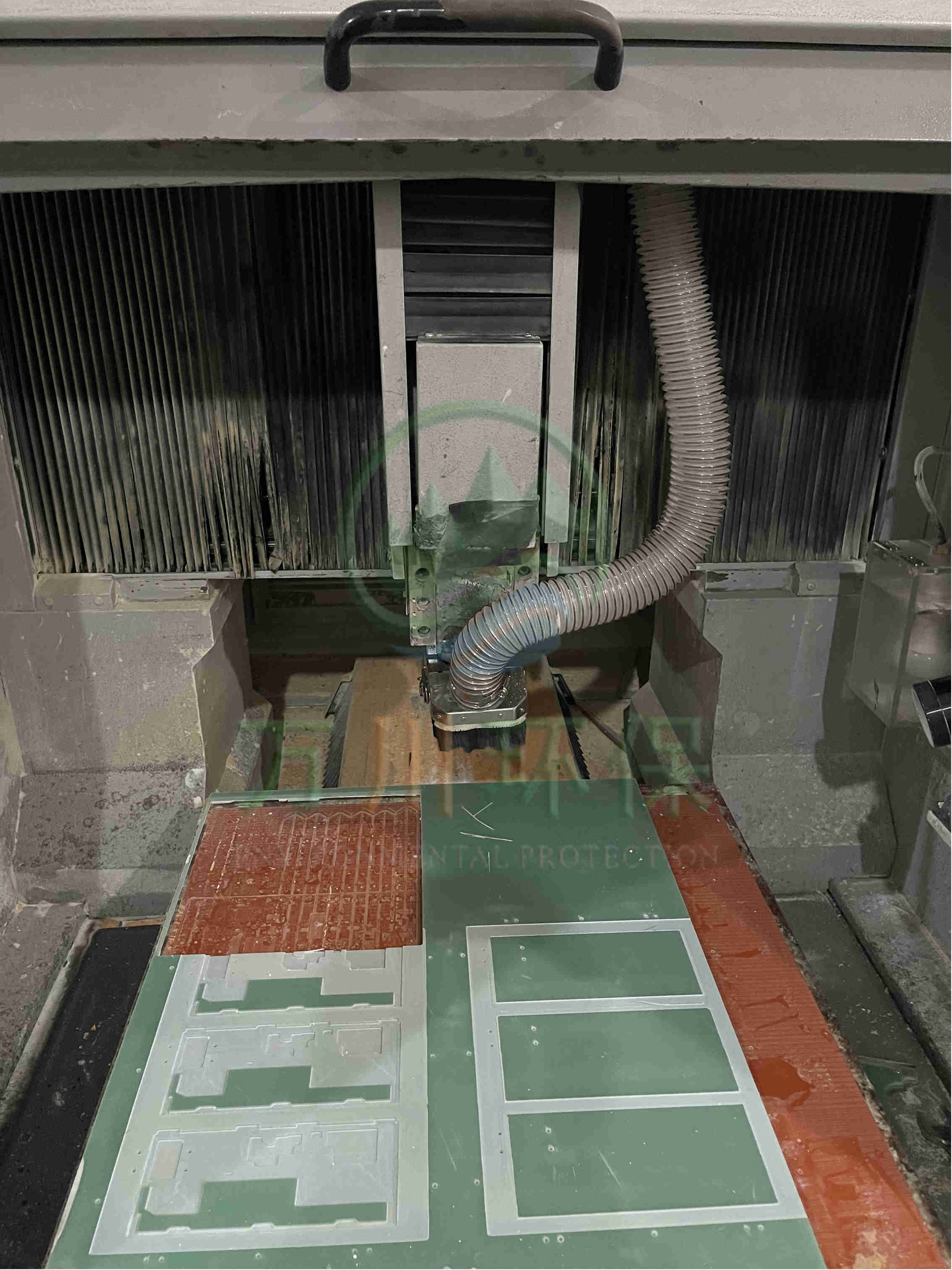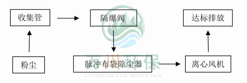 精雕機工作時產生的粉塵通過集氣罩、吸塵軟管進入到脈沖布袋除塵器中過濾凈化,粉塵落入灰斗,凈化后的廢氣通過系統(tǒng)風機達標排放。