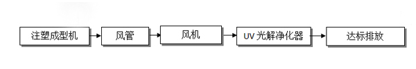 該公司在生產(chǎn)過(guò)程中有注塑成型工序,該工序產(chǎn)生了一定量非甲烷總烴有機(jī)廢氣。根據(jù)廠(chǎng)房提供的資料,我們工程師在參考了廣東省地方標(biāo)準(zhǔn)《大氣污染物排放標(biāo)準(zhǔn)》(DB44/27-2001),中華人民共和國(guó)《大氣污染物綜合排放標(biāo)準(zhǔn)》(GB16297-1996)后,根據(jù)以往工程經(jīng)驗(yàn),為該企業(yè)選擇了UV光解為主體處理工藝。