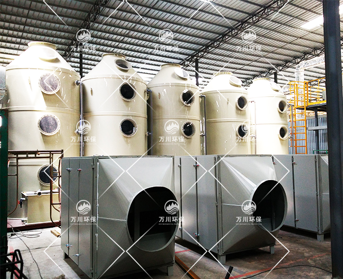 根據廠方提供的資料及現場勘察的情況。其噴漆廢氣的來源主要為無塵噴漆車間內的5條自動噴涂線。在生產過程中有噴漆,該工序產生了一定量含三苯有機廢氣和噴漆粉塵,該廢氣不僅對環(huán)境造成污染,而且對人體有較大的危害作用,同時也破壞了周邊的環(huán)境,造成了不良的影響,需進行處理后排放。我們工程師分析了該廢氣的特點和以往的案例經驗,采用了“水簾柜+噴淋塔+活性炭吸附塔”這套解決方案。